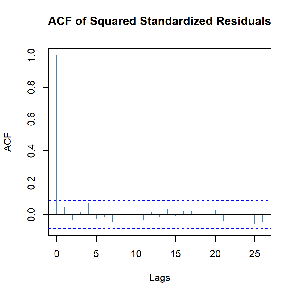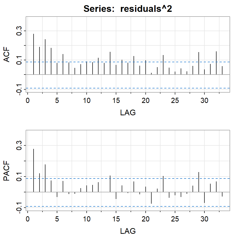 \[r_t= 0.0015 -0.59 r_{t-1} + \varepsilon_t + 0.59 \varepsilon_{t-1}\] \[\varepsilon_t=\sqrt{h_t} \epsilon_t\] \[h_t= 0.0000017 + 0.16 \varepsilon_{t-1}^2 + 0.83 h_{t-1}\]
