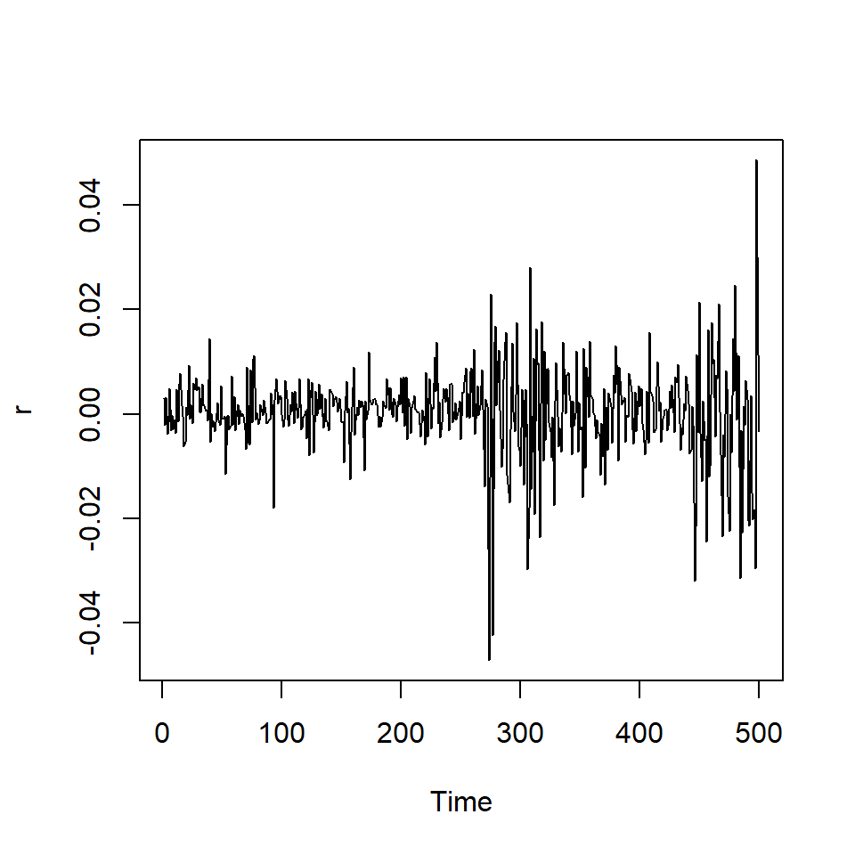 \[X_t=\sqrt{h_t} \epsilon_t\] \[h_t= \alpha_0 +\alpha_1 X_{t-1}^2+\alpha_2 X_{t-2}^2+...+\alpha_r X_{t-r}^2\] en donde \(\epsilon_t\) es ruido blanco gaussiano estándar, i.e. \(\epsilon_t \sim i.i.d. N(0,1)\), y \(\alpha_0 >0\) y \(\alpha_i \geq 0,i=1,...,r\).