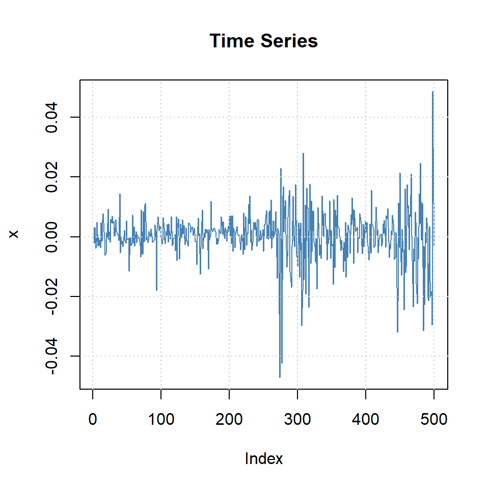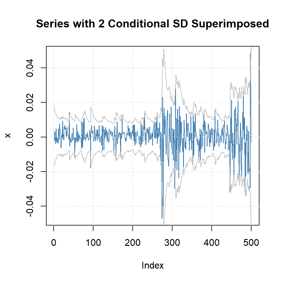 \[X_t=\sqrt{h_t} \epsilon_t\] \[h_t= \alpha_0 + \alpha_1 X_{t-1}^2 + \beta_1 h_{t-1}\]