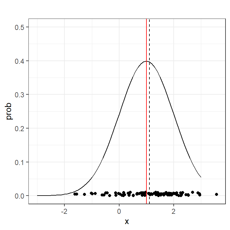 Ejemplo: En las siguientes dos figuras muestran \(n = 100\) puntos muestrales para una población infinita con \(N(\mu = 1,\sigma^2=1)\), con la densidad y la media en rojo, pero con: