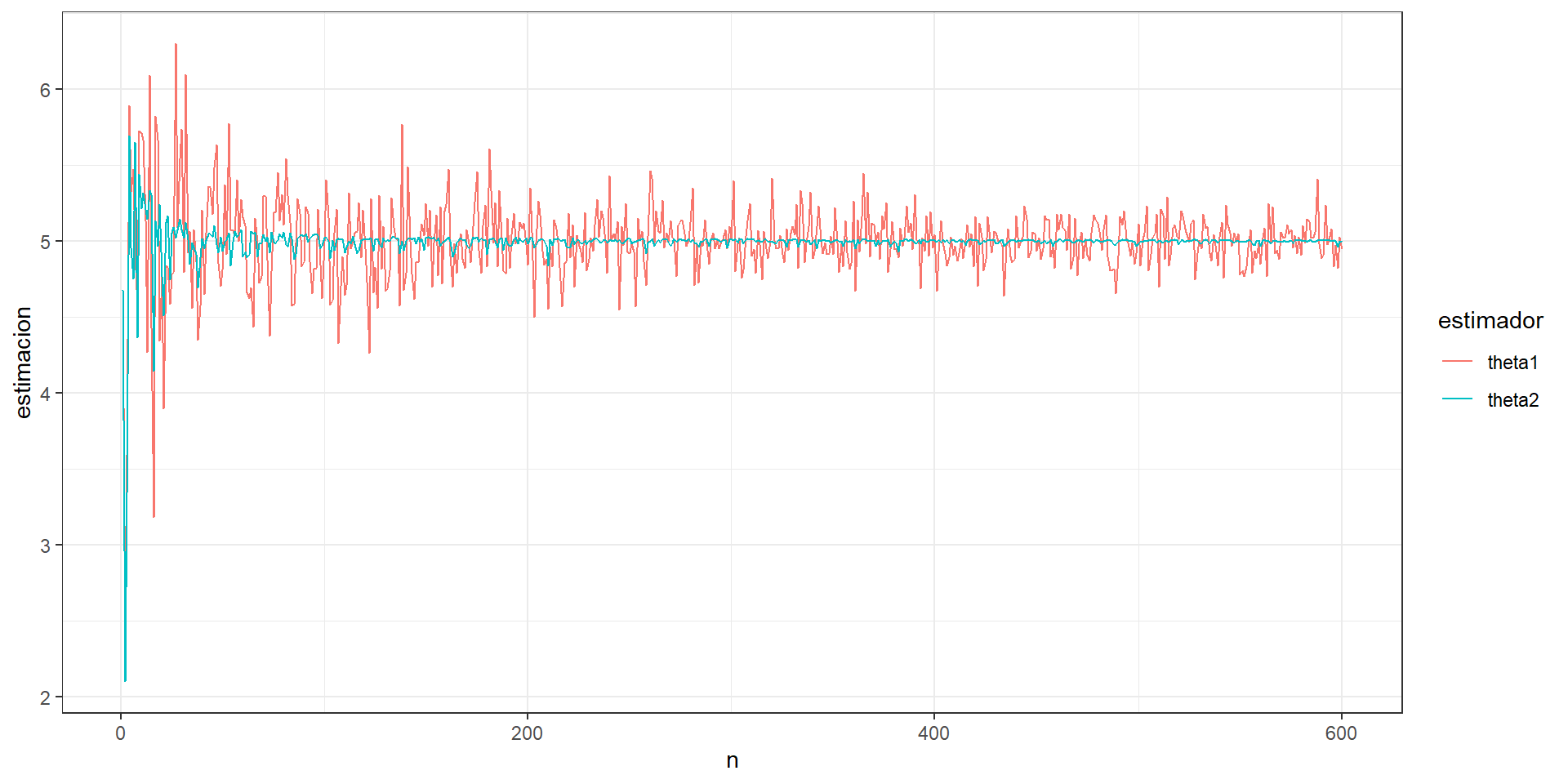 Haciendo una simulación, con \(\theta\) = 5, podemos observar que ambos estimadores convergen a \(\theta\) conforme el tamaño de muestra va aumentando. Podemos decir que \(\hat{\theta}_{1}\) y \(\hat{\theta}_{2}\) son estimadores consistentes para estimar \(\theta\).