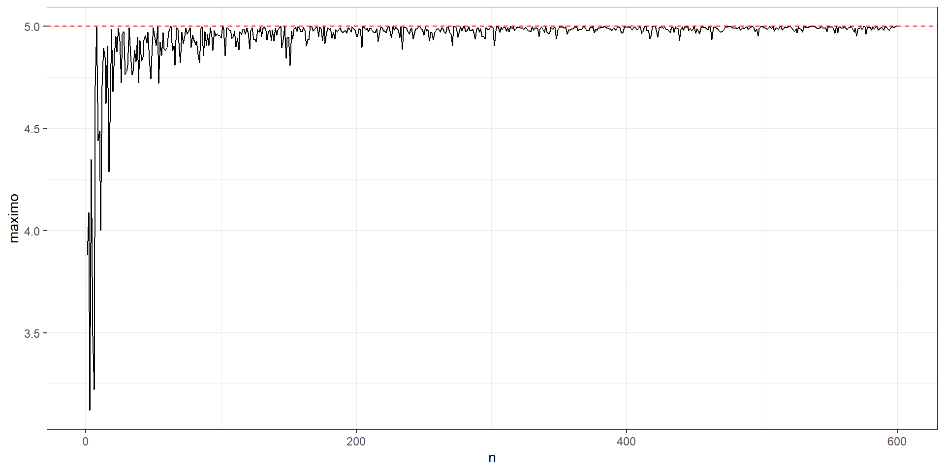 Si observamos el gráfico de \(X_{(n)}\) notamos su consistencia pero sin ser insesgado. Esto significa que existen estimadores sesgados y consistentes.