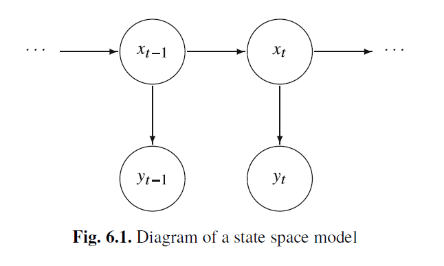 Un proceso latente (o oculto) \(x_t\): Se supone que es un proceso de Markov, i.e. \[P(x_t|x_{t-1},x_{t-2},...)=P(x_t|x_{t-1})\]