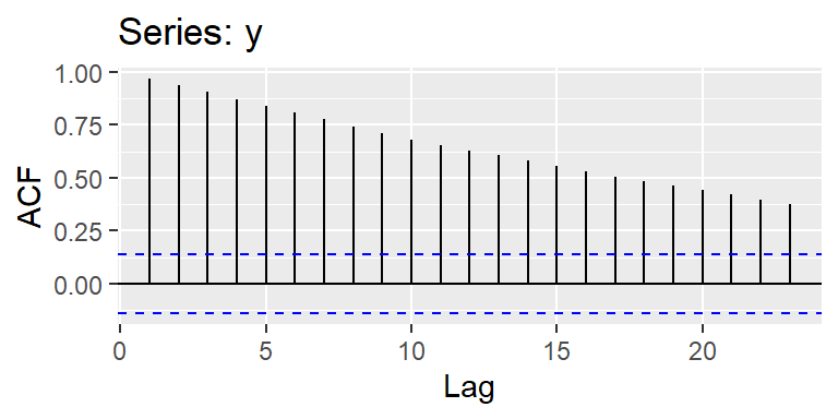 \[\begin{align*} \hat{\rho}_X(h) &= r_X(h) = r_h \\ &= \frac{\hat{\gamma}_X(h)}{\hat{\gamma}_X(0)} = \frac{\sum\limits_{t=1}^{T-h} (X_{t+h}-\bar{X})(X_t-\bar{X})} {\sum\limits_{t=1}^{T} (X_t - \bar{X})^2} \end{align*}\]