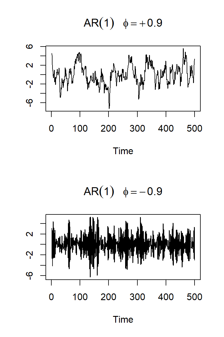 Veamos dos realizaciones de \(T=500\) de cada caso: \(\phi=0.9\) y \(-0.9\).