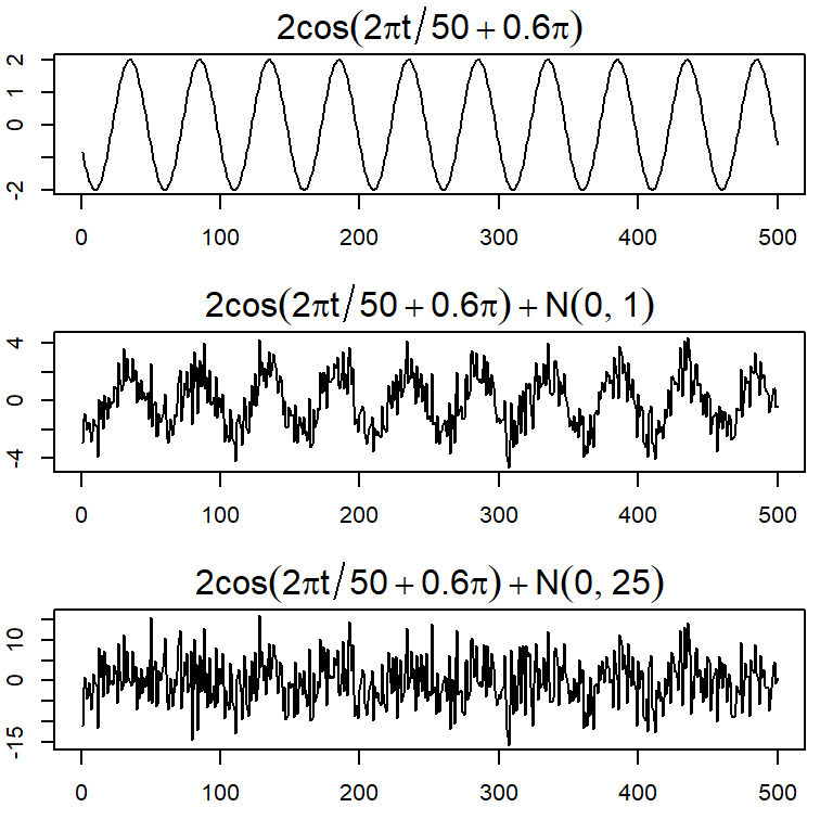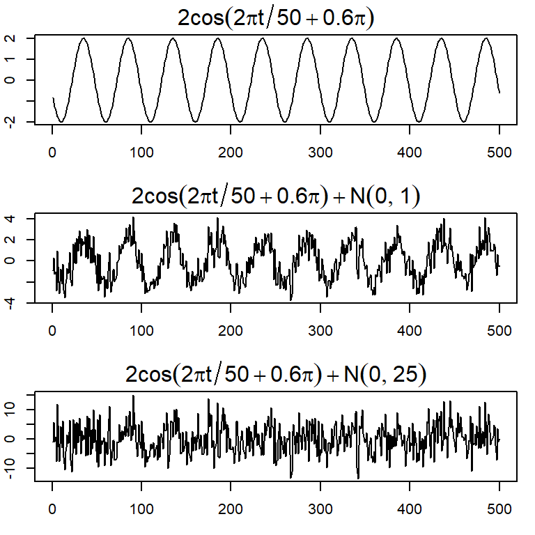 Considere \(x_t=2 \cos \left( 2 \pi \frac{t+15}{50} \right)+ w_t\) para \(t=1,...,500\).