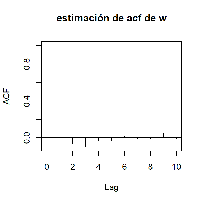 La función de autocorrelación es dada por: \[ \rho_w(t,t+h)=\left\lbrace \begin{aligned} 1, & & h = 0 \\ \frac{2}{3}, & & |h| = 1 \\ \frac{1}{3}, & & |h| = 2 \\ 0, & & |h| > 2, \end{aligned} \right. \]