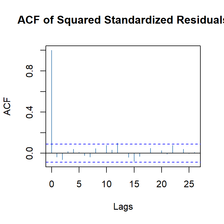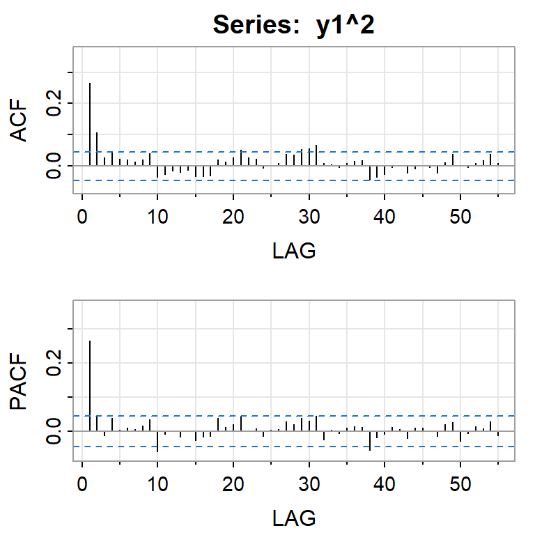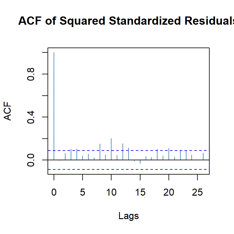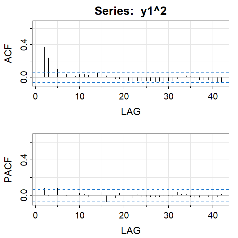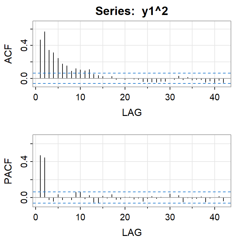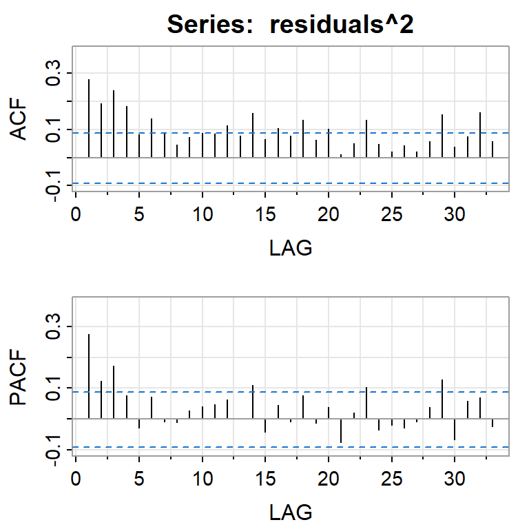- Note que todavía existe autocorrelación de los residuales al cuadrado.