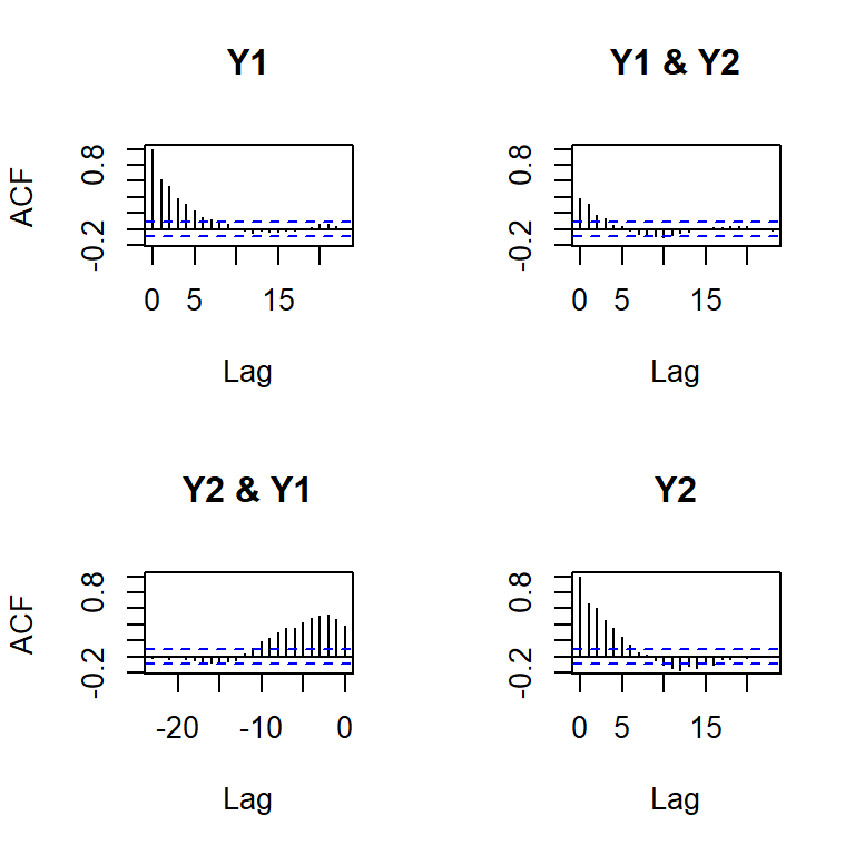 <- ts(simVAR2$series, names = c("Y1", "Y2"))