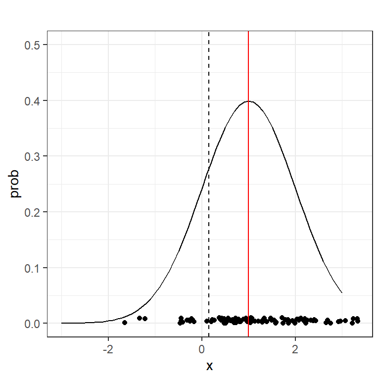 Ejemplo: En las siguientes dos figuras muestran \(n = 100\) puntos muestrales para una población infinita con \(N(\mu = 1,\sigma^2=1)\), con la densidad y la media en rojo, pero con: