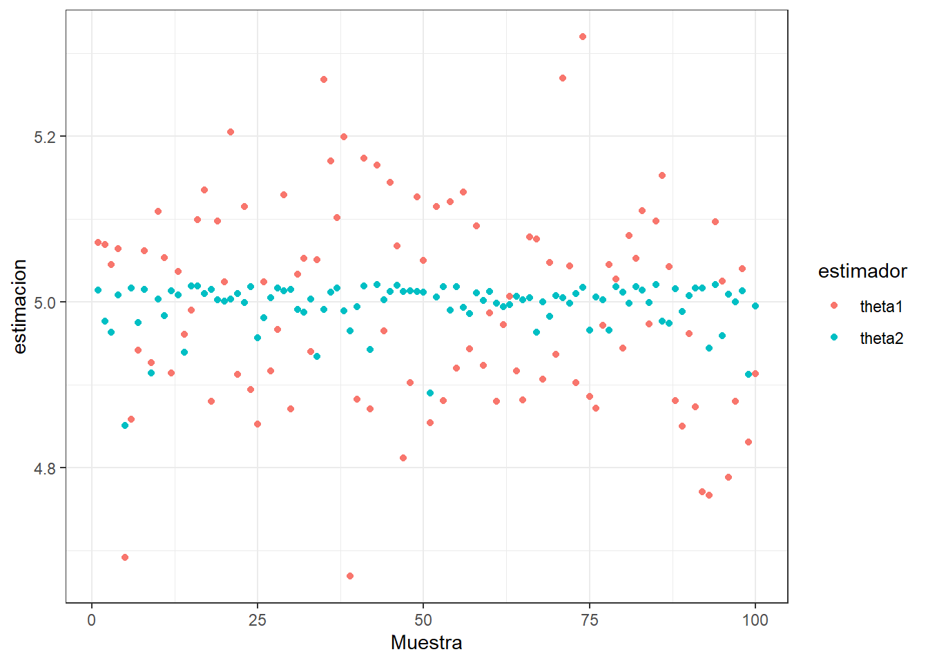 En la siguiente figura, se observa \(\hat{\theta}_1\) y \(\hat{\theta}_2\) calculados de 100 muestras independientes. En dicha simnulación, se supone que \(\theta=5\) y \(n=45\). Podemos observar como la eficiencia de los dos estimadores.