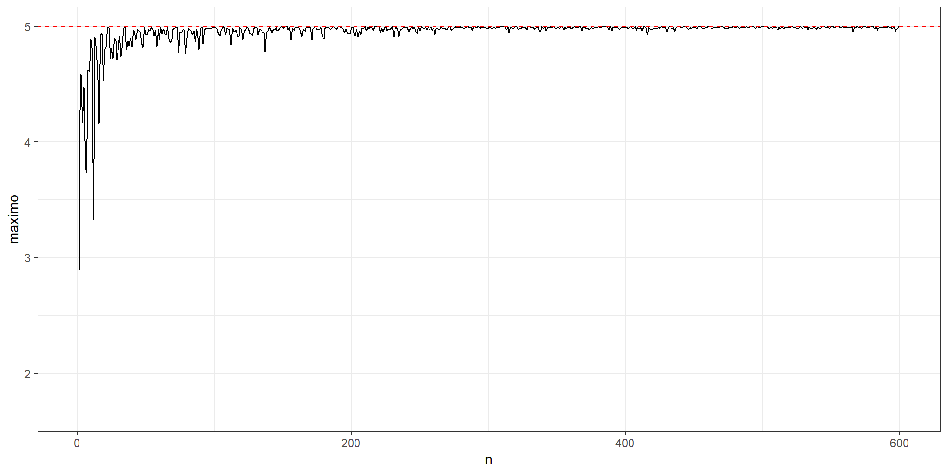Si observamos el gráfico de \(X_{(n)}\) notamos su consistencia pero sin ser insesgado. Esto significa que existen estimadores sesgados y consistentes.