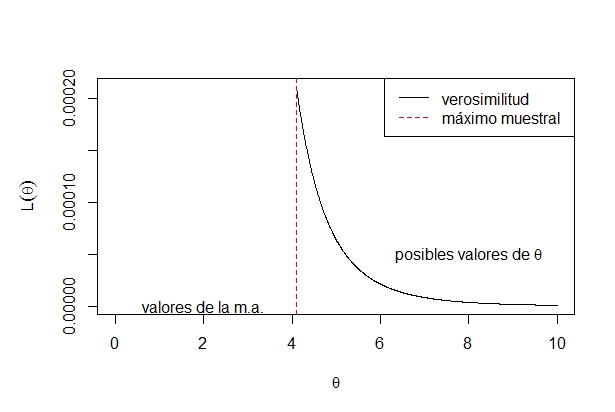 Figura 4. Verosimilitud de una \(Unif(0,\theta)\) a partir de una muestra aleatoria.