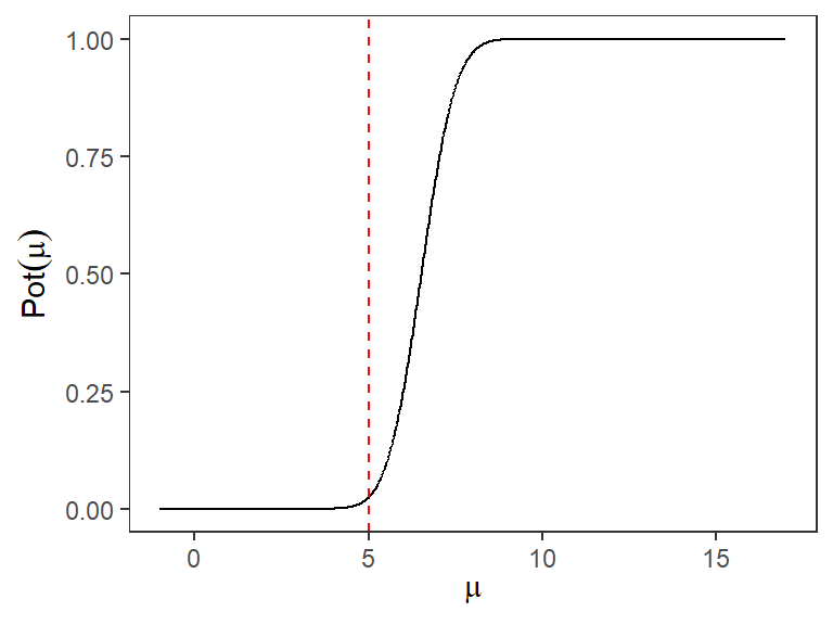 Solución: En este caso todo el espacio paramétrico \(\Omega\) se compone solo por dos valores de \(\mu\): \(\mu = 1\) y \(\mu = -1\). Por lo tanto debemos calcular la Potencia para cada uno de estos valores. Empezaremos por la Potencia en \(\mu = 1\):