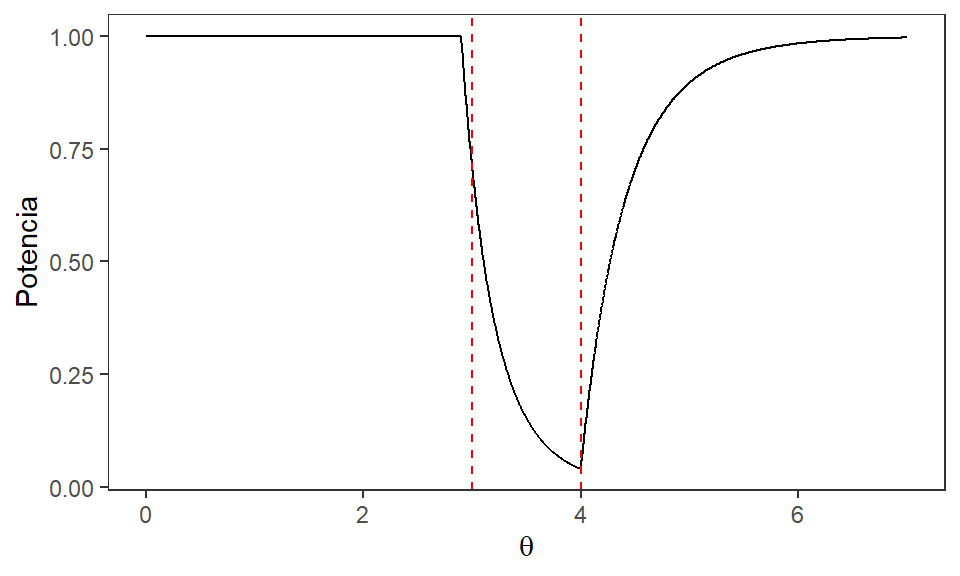 \(\Rightarrow \operatorname{Potencia}(\theta) = \left(\dfrac{2.9}{\theta}\right)^{n} + 1 - \left(\dfrac{3.9}{\theta}\right)^{n}\)