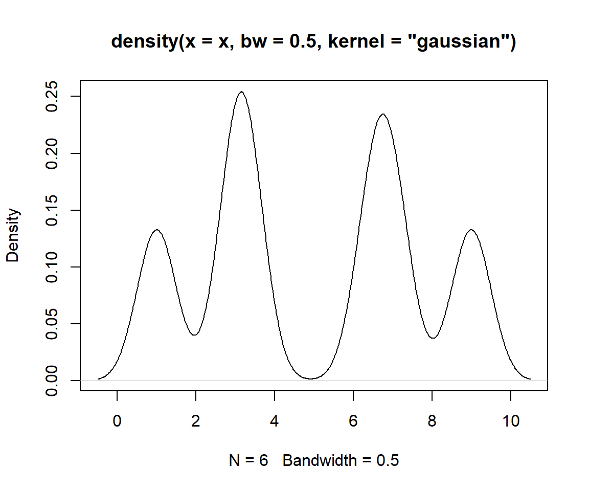 Ejemplo: Para una muestra de una población con distribución desconocida: \((1,3,3.3,7,6.5,9)\), estime la densidad usando el kernel gaussiano y \(h=0.5\).