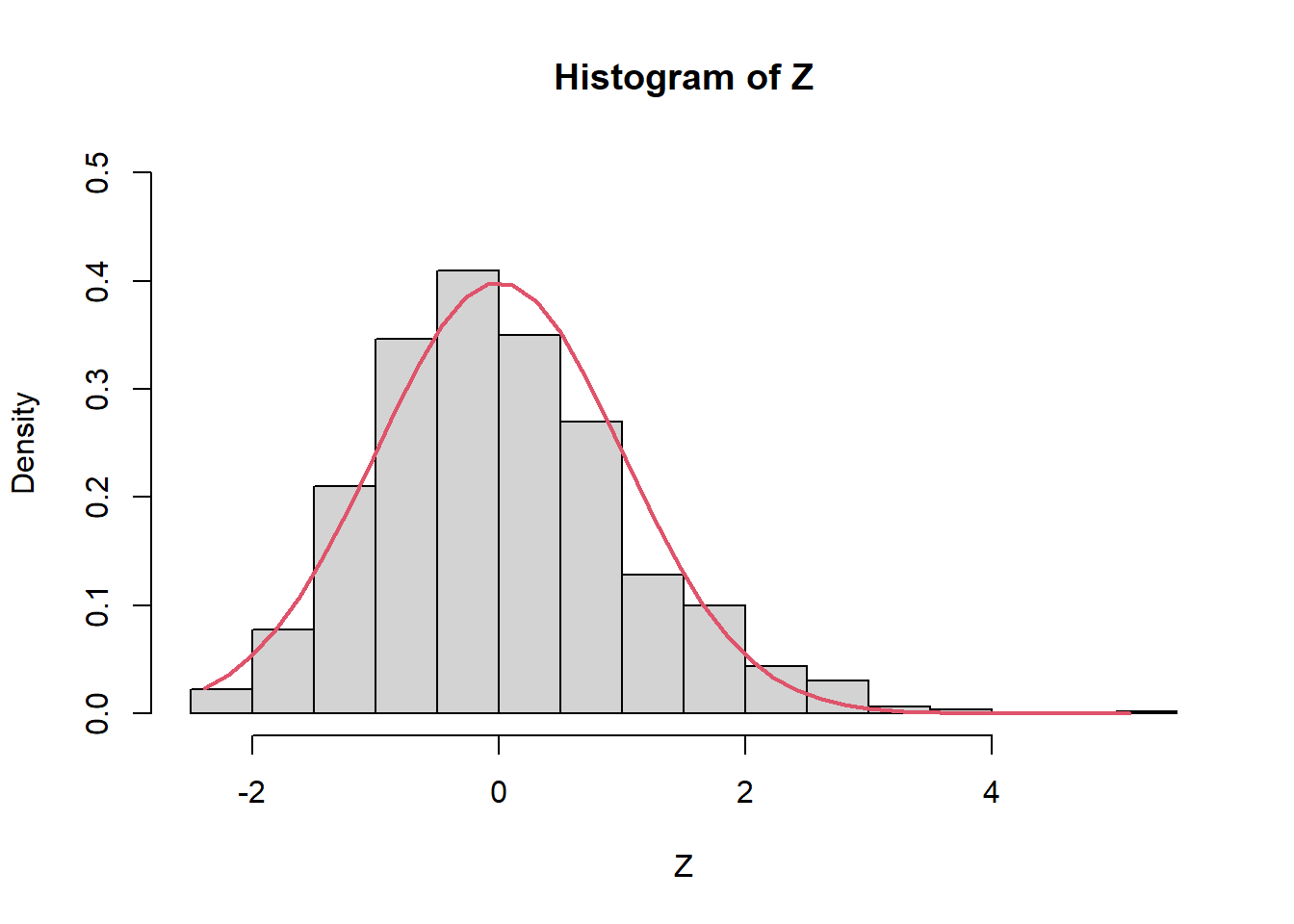 lines(Z2, dnorm(Z2, mean = 0, sd = 1), col = 2, lwd = 2)