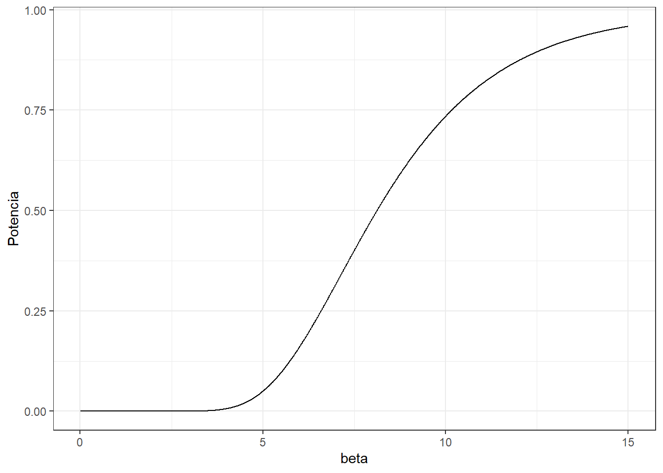 Por ejemplo, la potencia evaluada cuando \(H_0\) es cierta (\(\beta=5\)) es